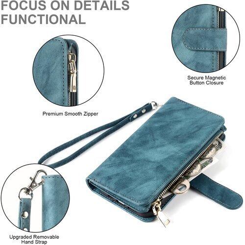 【実用性①:収納力抜群】カード収納が沢山あります。ファスナー式の小銭入れ、窓口式のカード入れ、カードスロット複数付き、それにピタッと閉じるマグネット式の留め具とスナップ式のプリップにより、大事なカードたちを完全に保護します。ちょっとした買い物や散歩にはショルダーにして、スマホだけで出掛けて十分です。