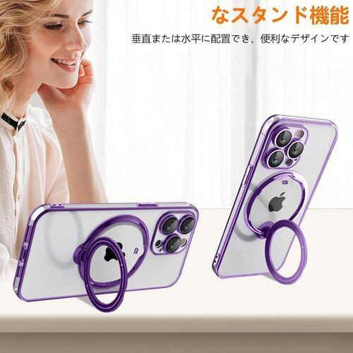 iPhone 13 用 ケース リング付き クリア磁気ケース 耐衝撃 Magnetic 対応 レンズフィルム 良好な光透過率 スタンド機能 角度調整可能 透明 TPU 指紋防止 落下防止 防塵 薄型 軽量 一体型 変形防止 全面保護カバー アイフォン用 ケース 紫 W-DDCX-33-05 2244