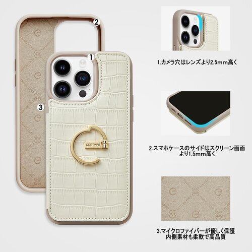 iPhone 15 Pro 6.1対応ケースリング付きグリップ CUSTYPE iPhone 15proケースカード入れ iphone 15 proケース背面手帳型 カードホルダー付き リングバンド スタンド機能 アイフォン15プロケース背面カード収納 財布付きiphone 15 pro ケース クロコダイル模様 レザーケース アイフォン15 pro適応ケース 6.1インチ ホワイト 2340