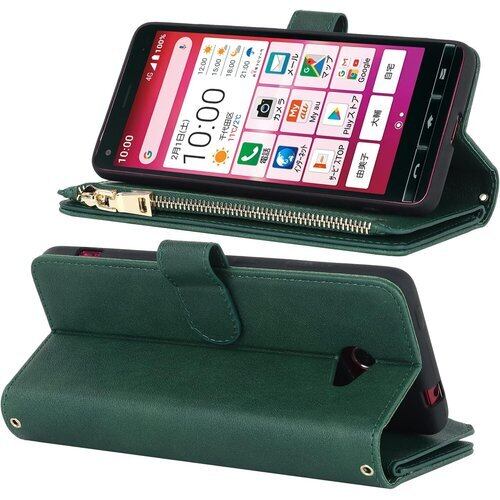 かんたんスマホ2 A001KC ケース 京セラー Basio 4 KYV47 縄掛けケース 手帳型 Basio4 KYV 47 財布型 ICカード コインポケット ストラップ付き カード 収納 小銭入れ ファスナーポケット付き PUレザー 6色 グリーン