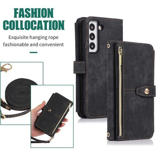 S22 galaxy ケース 手帳型 ショルダー スト ケース SC51C ケース s22 携帯ケース SCG13 カバー S22 スマホケース 手帳型 適用 case BonwFzin 折畳み ストラップホール付き カード収納 バッグ マグネット スナップ 肩がけ 首掛け 斜め掛け カードケース ファスナー ジッパー ストラップ付き カバー スタンド ショルダーケース クロスボディ カード入れ スマホケース レトロ ブラック 1676