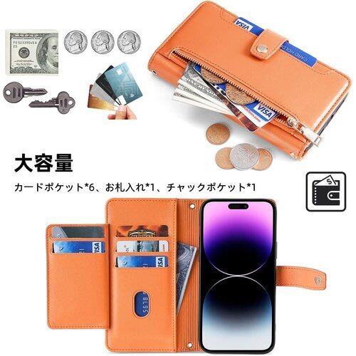 【収納力抜群】カードポケットが5個収納可能、サイドポケットが1個、チャックポケット1個、内側に2つのカードスロット、名刺、収納、外側にカードや小銭を収納できるジップ付き小銭入れを装備し、大切なカードなどを守ります。美観と実用性を兼ね備えた、とても便利でスタイリッシュなウォレットケースです。