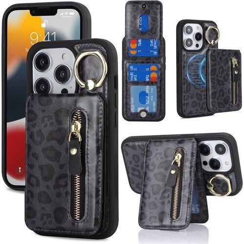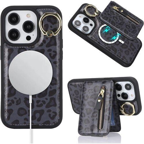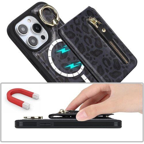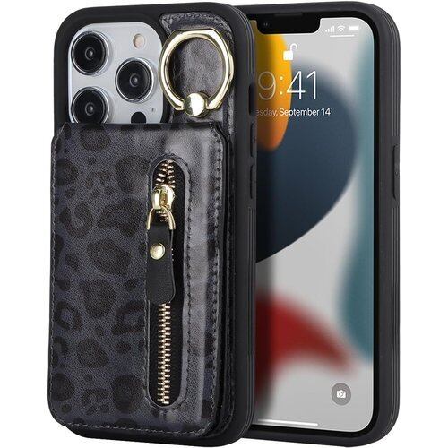 iPhone 13 Pro ケース 分離可 カードケース リング付きケース magsafe対応ケース マグセーフ magsafe用 アイホン13 プロ リング付き カバー スマホケース アイフォン 13pro アイフォン13 プロ case 適用 iCoverCase リング カード収納 スナップ 横置き スタンド マグネット ファスナー カード入れ 携帯カバー 豹柄 ヒョウ柄 ブラック 2360