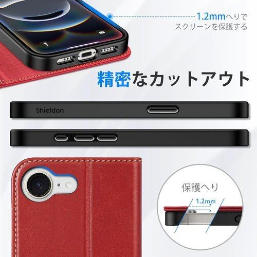 SHIELDON iPhone 16e対応ケース 本革 手帳型 アイホン16e用 スマホカバー 衝撃吸収 TPU素材 カード収納 横置きスタンド機能 マグネット内蔵 RFIDブロッキング 全面保護 あいふぉん16e 対応スマホケース 2025年発売 6.1インチ 5G レトロレッド 3025