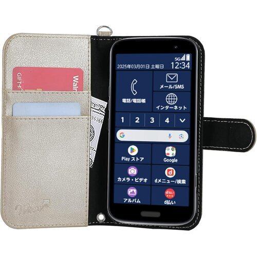 wisers らくらくスマートフォン F-53E ケース 手帳型 スマホケース 対応 ゴールド ストラップ 2種付き ハンドストラップ/ネックストラップ 2025年 新型 3062