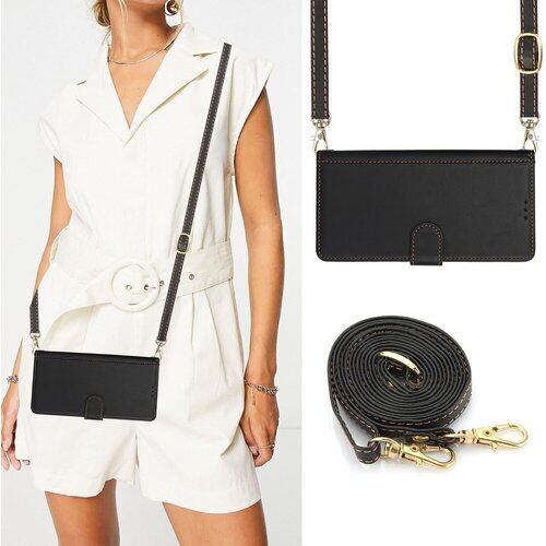 このスマホケースは、交通系カード、銀行カード、運転免許証などを簡単に収納できるカードホルダーを備えており、外出時に財布を持ち歩く必要がありません。さらに、同色の長短2種類のストラップが付いているので、斜め掛け、首掛け、手持ちと様々なスタイルで持ち運べ、両手が自由になります