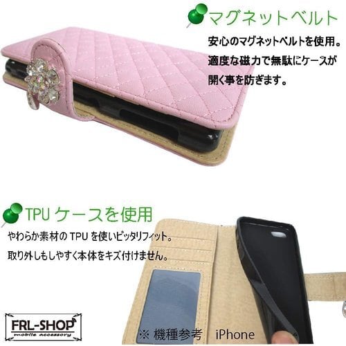 きらりと光るキレイでかわいラインストーンの花としずく ・ 手帳型ならではの保護性能 ・ 横置きスタンド機能 ・ カードポケット