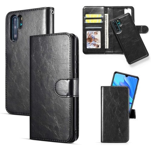QLTYPRI Huawei P20 手帳型 分離式 ケース 取り外し マグネット PUレザー TPU シンプル カード収納 カバー ストラップ付き Suica 改札 - ブラック 218