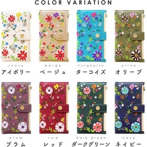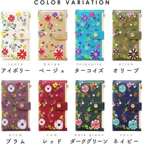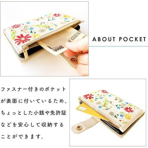 AQUOS sense 2 SH-01L doo SHV43 かんたん SHV43K au SH-M08 SHARP Android One S5 専用 手帳型ケース。小銭や免許証等の収納に便利なファスナー付きの手帳型ケースです。上品なサフィアーノ生地に、色鮮やかな花柄の刺繍を施しています。