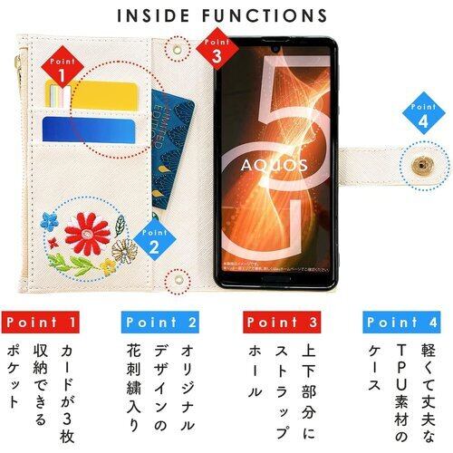 AQUOS sense 2 SH-01L SHV43 SH-M08 かんたん SHV43K Android one S5 用 ケース カバー 手帳型 手帳型ケース SH01L SH-01Lケース SHV43ケース SH01Lケース AndroidoneS5ケース 手帳ケース スマホケース おしゃれ花刺繍 アイボリー 28
