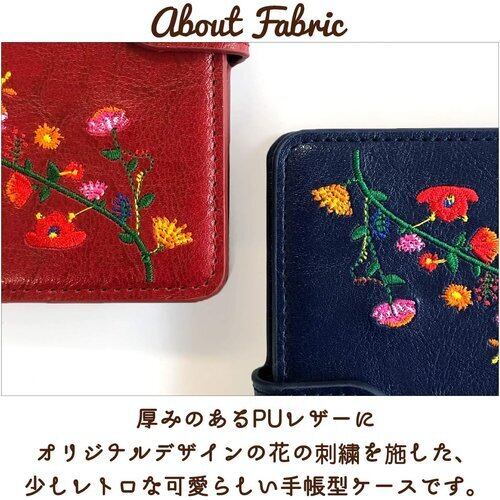 花の刺繍が入ったスマホケースです。厚みのある生地に刺繍を施すことで、落ち着いた高級感のあるケースになっています。
