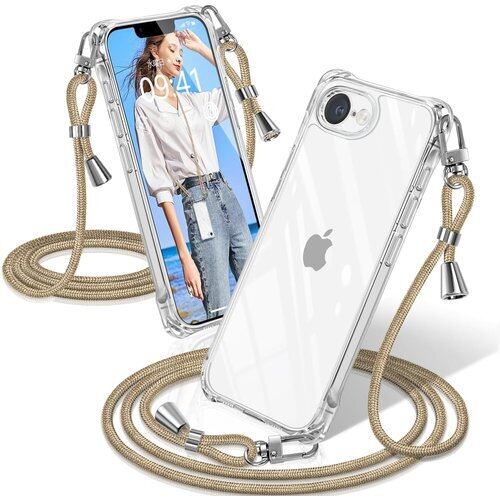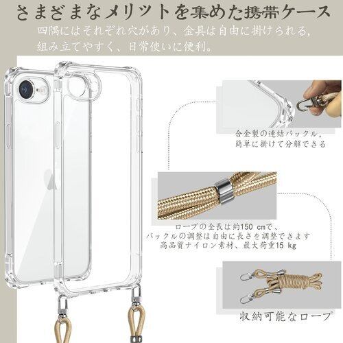 用の iPhone 16e ケース クリア ショルダー 耐衝撃 スマホケース アイフォン16e カバー 透明 織りストラップ付き 肩がけ 首掛け 紐付き 縄掛け 斜めがけ クロスボディ 多目的キャリー ファッションデザイン TPUスマホ ゴールド 109