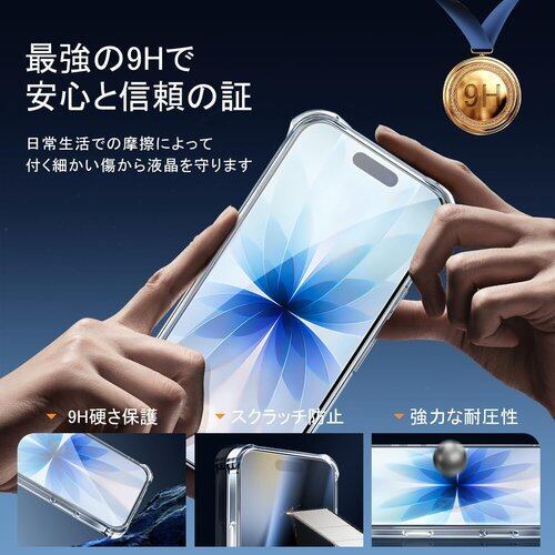 特徴 硬度9Hの素材はしっかりとケアします保護を提供し、耐衝撃、耐落下、スクラッチ防止 耐黄、耐熱、耐スクラッチ